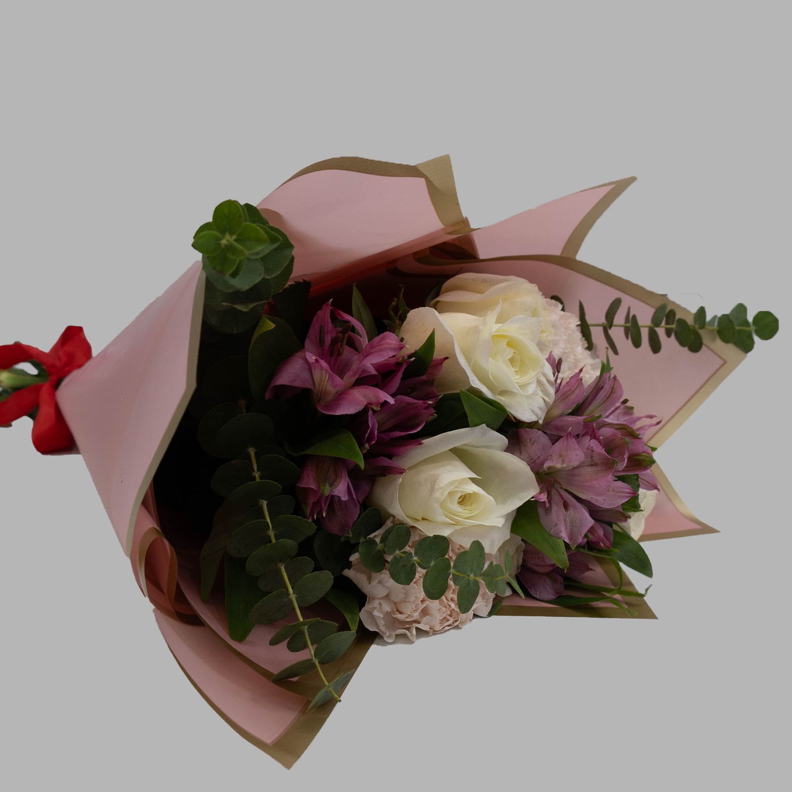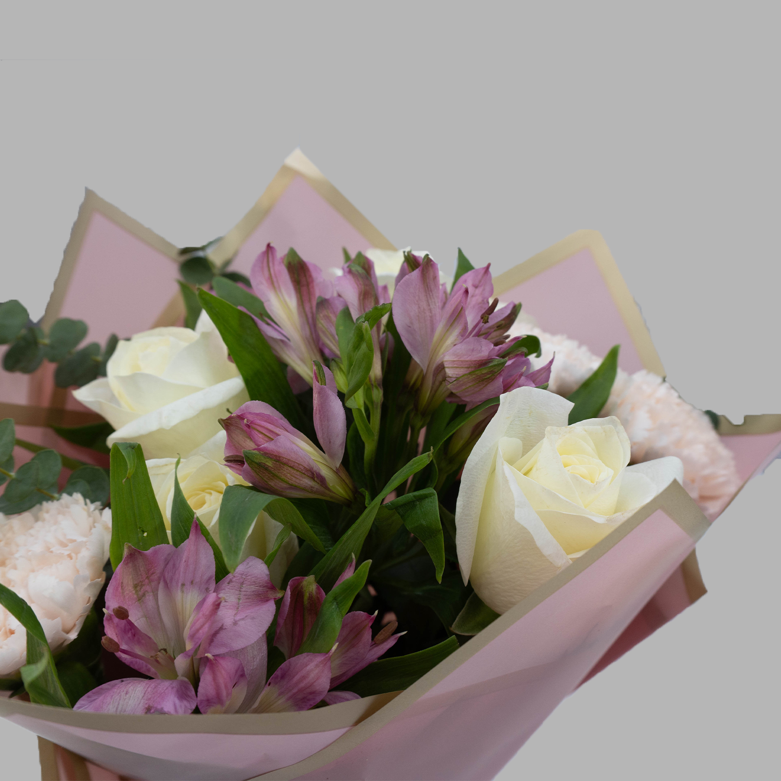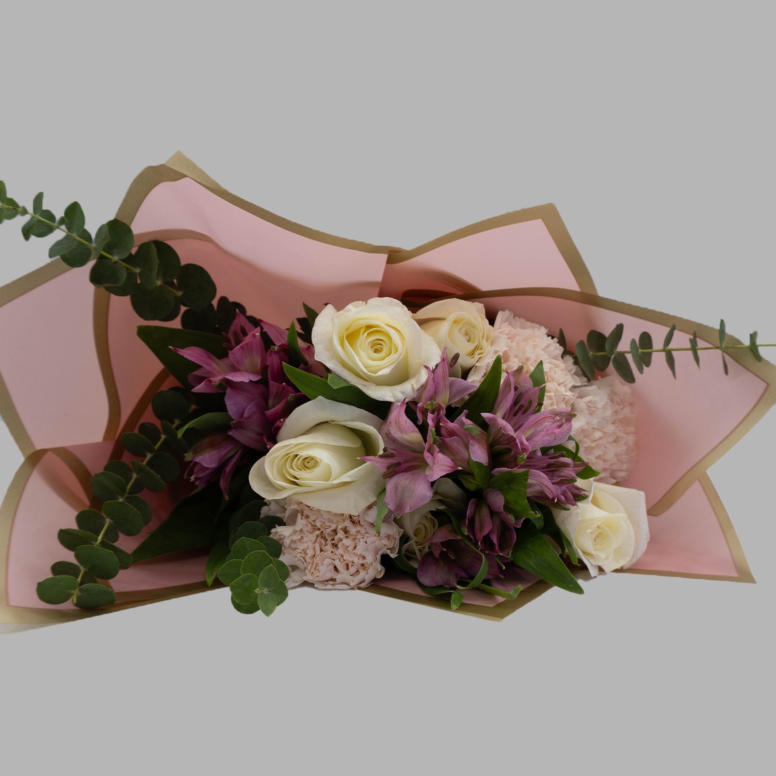 Soft light pink roses and warm peach carnations blend effortlessly with pure white alstroemeria and fresh eucalyptus leaves. This bouquet whispers sweetness and elegance, perfect for moments that call for gentle beauty and heartfelt warmth. Choose Blush Belle to share tenderness and grace with someone special.